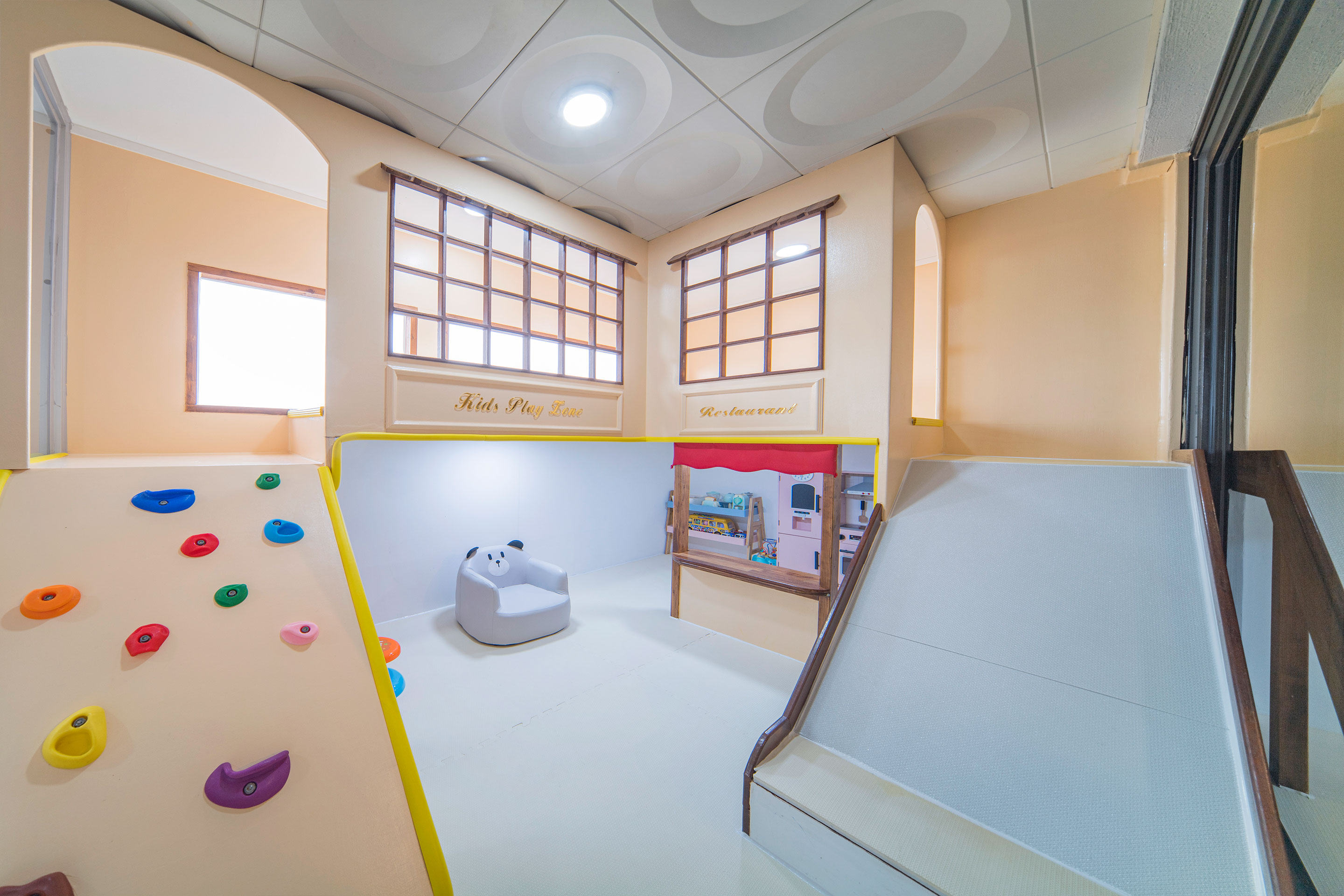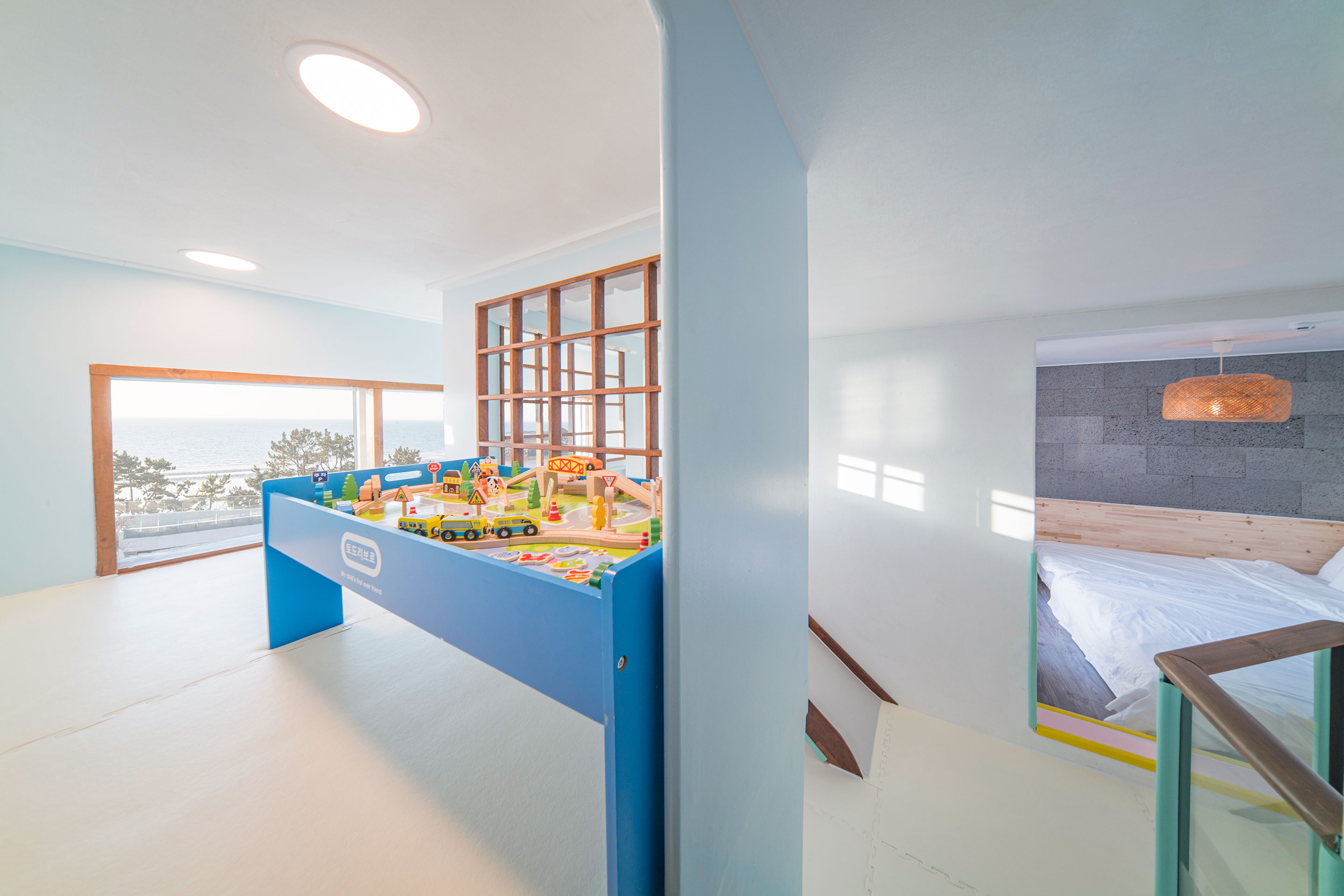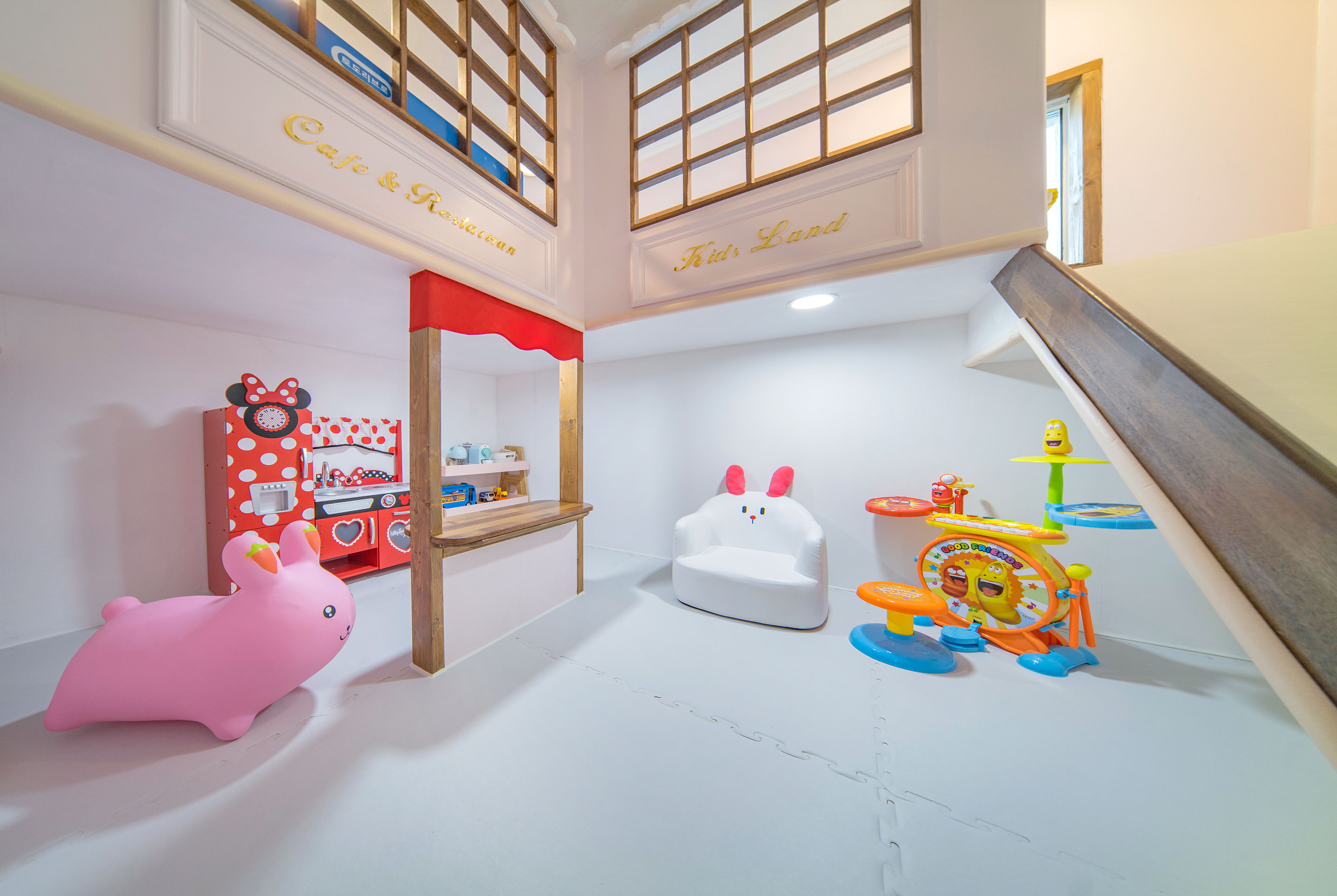 소꿈놀이, 미끄럼틀 등 다양한 놀거리들이 가득한 키즈룸입니다.